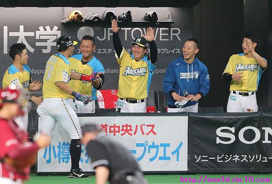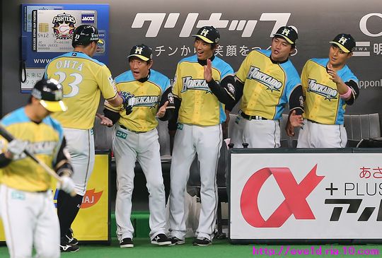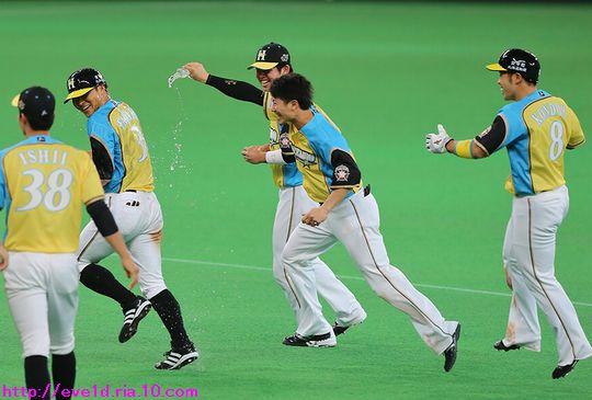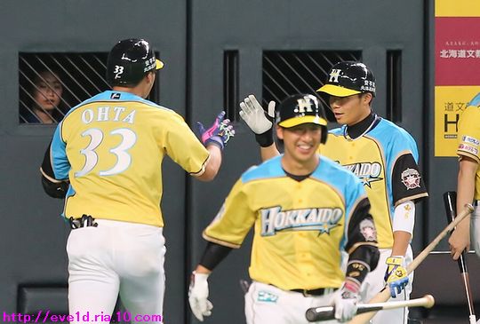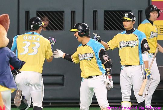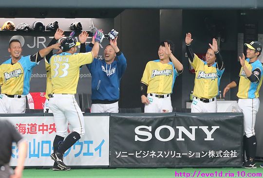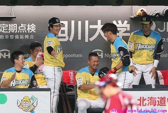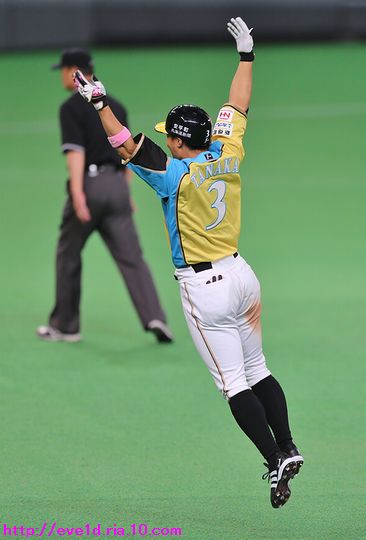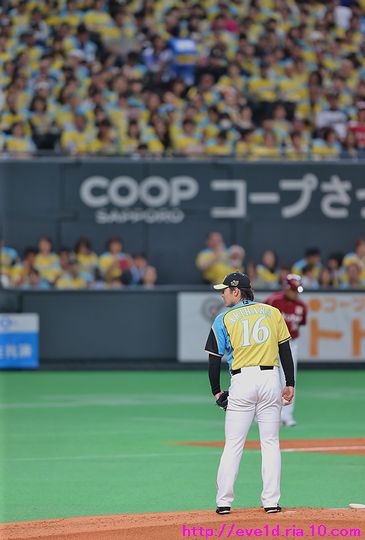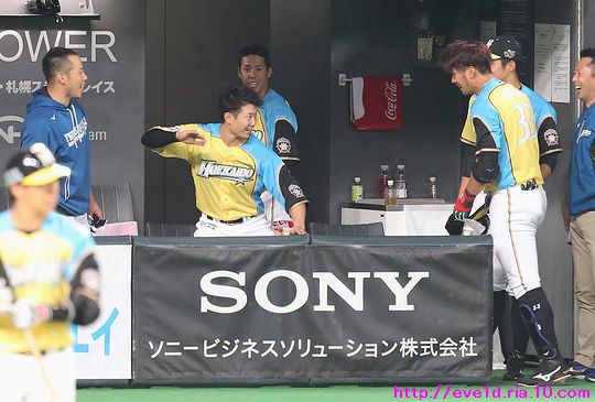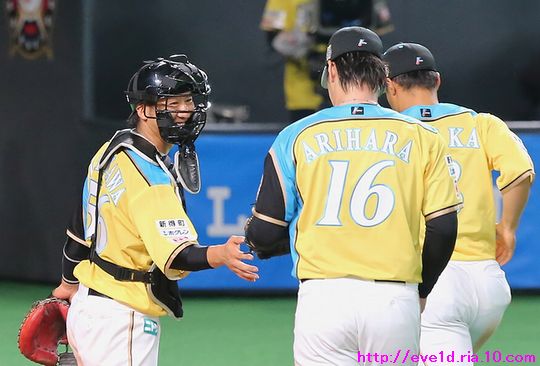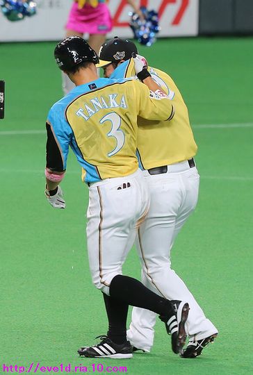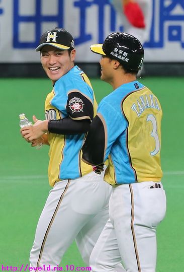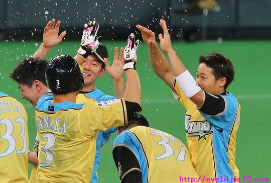 賢介さんがハッピーイエロー伝説の先陣を切るサヨナラ勝利γ(▽´ )ツヾ( `▽)ゞ ファイターズ 2017年04月30日 4月29日、札幌ドームでの東北楽天ゴールデンイーグルス戦。 もう載せたい事があり過ぎる最高の試合だったのですが、 次の観戦もありイベント参加などで球場入りが早いので 写真解説はなるべく簡単めにさせてもらいますが 写真枚数をたくさん載せることにこだわっての更新です(ノ´▽`)ノ ⌒(喜) 2017 WE LOVE HOKKAIDOシリーズが始まりました♪ 満員のハッピーイエローに包まれて 好投を魅せた有原航平投手。 勝利投手になれなかったのは残念ですが、 バッテリーを組んだ市川友也選手の表情を見れば どれだけ良い投球だったのか分かりますし 必ず次に繋がると信じています(*^o^)乂(^-^*) この試合最大の見所と言えば、 まずは大田泰示選手の移籍第1号ホームランですо(ж>▽<)y ☆ 大田選手も含め球場全体が歓喜に沸き上がりますγ(▽´ )ツヾ( `▽)ゞ 待ちに待った大田選手のホームランですから 当ブログもいつも以上に全力のハイタッチ祭りを開催します(ノ^^)八(^^ )ノ ジャイアンツから移籍組の市川選手は自分の事のように嬉しそうo(^▽^)o そして、中島選手は何やら人差し指を1本立てていますが、 もしかして、中島選手のプロ1号と大田選手の移籍1号とで どちらが早くホームランを打つかを競争していたのかな!? 同じ学年でプロ9年目、全くタイプの異なる2人ですが 同じチームで競い合うファイターズならではの良いムード♪ 中島選手「今回はオレの負け!移籍1号おめでとう(ノ^^)八(^^ )ノ」 さぁ、ここからは枚数勝負!! ドンドンいきますので、みんなの表情に注目してお楽しみください(ノ^^)八(^^ )ノ 同じスラッガータイプの中田選手が1番喜んでいたかもしれません! 西川選手「卓さんとの勝負に勝ったなら次はオレと勝負だっ(σ・∀・)σ」キメポーズ 今のファイターズは『はるたくコンビ』が中心となり 良いムードを作っているのかもしれませんね! 大田選手に求められているものが分かっているだけに この移籍第1号が気持ちの部分も含めて自他共に ファイターズ大田泰示が誕生した瞬間かもしれませんね(b^-゜) 大田選手の記念すべき1号ホームランですから このまま勝利したかったのですが、 首位を走るイーグルスの勢いが簡単に勝たせてはくれません!! 同点に追い付かれ普通にイーグルスの勢いを考えるなら このまま勝ち越されても不思議はありませんが、 この状況でも僕は絶対に勝てると勝利を確信していました! それは、YMCAでファイターズガール畠山茉央ちゃんが すぐ目の前で踊ってくれた試合は勝率100%という 無敵のジンクスが発動しているからです(*゜▽゜ノノ゛☆ ハッピーイエローを身に纏い笑顔と共に 勝利を運んできてくれたと信じて疑いません(ノ´▽`)ノ ⌒(勝) 予想的中!! 9回裏に田中賢介選手がサヨナラタイムリーヒット(≧▽≦) しかも、この試合は函館の実家から 田中選手ファンの母親が観戦に来ており 隣りで観戦していたので喜び倍増о(ж>▽<)y ☆ 母親が「賢介さん」と呼んでいたので ここからは田中選手の事は賢介さんとします! 賢介さんが笑顔でガッツポーズо(ж>▽<)y ☆ ベテランの賢介さんがピョンピョン飛び跳ねて みんな早く来いと手招きしながら大喜び♪ 一番乗りは足が速くないはずなのにレアード選手(°∀°)b お互い飛び付き熱い抱擁タイム(/ω\) そこに近藤の健介さんも抱擁の仲間入り(/ω\) 次の瞬間には歓喜のシャワータイムγ(▽´ )ツヾ( `▽)ゞ スピードスターが何故一番乗りじゃなかったかというと、 水掛け担当で仕込みがあったからだったんですね( ´艸`) 西川選手のスピードからは流石の賢介さんも逃れられませんε=ε=ε= ヾ(*~▽~)ノ シャワータイムも終わりを迎えハイタッチで歓喜の時間が終了かと思いきや・・・ ファイターズのサヨナラ勝利名物!? 日本シリーズでも大谷翔平選手に炸裂させていました 鍵谷バズーカが賢介さんに炸裂!! あまりの威力に立ち尽くす賢介さん(x_x;) 賢介さん大激怒ヾ(▼ヘ▼;) 鍵谷投手「すいません!もうやりません(→o←)ゞ」 賢介さん「けど、サヨナラの水掛けは清々しいなぁ~」 きっとまたやりそうな鍵谷投手の悪戯っ子な表情と サヨナラ勝利のイメージが強い賢介さんですから またこんな光景が見られそうですね( ´艸`) 苦しい時を乗り越えたからこそ見られたお立ち台での素敵な笑顔(*^▽^*) そして、ハッピーイエローのユニフォームが伝説になるくらい 勝ち続けてくれることを誓ってくれました♪ 勝利のジンギスカンダンスでは茉央ちゃんが来てくれました(*゜▽゜ノノ゛☆ そして、勝利の喜びを分かち合いました☆-( ^-゚)v そして、母親には賢介さんをこんなに間近で見させてあげられて 最高の親孝行が出来ました(o*゜∇゜)o~♪ マイヒーローの有原投手・大田選手、 マイヒロインで勝利の女神な茉央ちゃんの大活躍♪ そして、母親とみんなのヒーロー賢介さんが 先陣を切って魅せたハッピーイエロー伝説!! もう、本当に最高の勝利でしたо