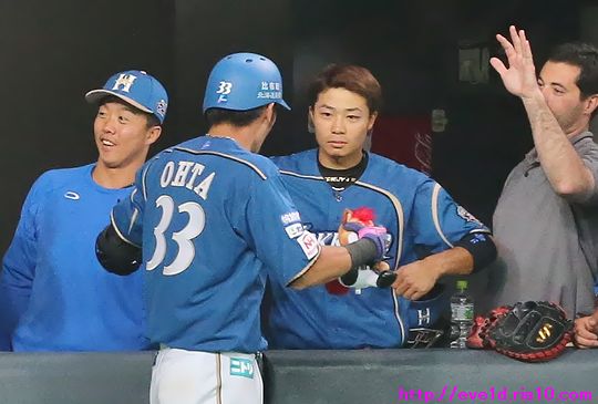 今回は西川遥輝の素敵さ&大田泰示HRゴリマッチョ祭り特集だよp(^-^)q ファイターズ 2018年05月05日 5月4日、札幌ドームでの千葉ロッテマリーンズ戦。 入場前に練習見学イベントに参加してきました♪ 前日更新の記事にも書いた可愛らしいシャツ姿の 西川遥輝選手全身バージョンが撮れました♪ 中島卓也選手も撮れましたよ♪と はるたくコンプリートv(^-^)v イベントでは大田泰示選手と加藤貴之投手との 2人の天然キャラがぶつかり合う面白いやりとりも撮れたので 後日に特集したいと思っています( ´艸`) イベントを終えて入場してからも 再度練習を見に行きましたε=ε=ε= ヾ(*~▽~)ノ そして、練習を終えてあがってくる清宮幸太郎選手が見えたので またお声掛けできるかなぁ~!?と思っていると・・・ たくさんの記者達に囲まれてしまったので お声掛けは断念(;^_^A コリャ ムリダ お声掛けは入場ゲートでお出迎えをしている ファイターズガール・畠山茉央ちゃんにしてきました(〃∇〃)ゞ 前髪でリボンを作るヘアアレンジVer.を撮らせて頂きました♪ 入場ゲートのお出迎えで素敵なシーンを目にしました! GWでたくさんのファンが来場する中で 時間ギリギリまでお出迎えを頑張っていたFGメンバー達。 もう帰らなければならない時間となり急いで 入場ゲートを後にして行きました! ところが大慌てで入場ゲートに 戻ってくるメンバーがいますヽ(;´ω`)ノ タイヘン タイヘン 忘れ物をしたんだろうな!と思って見ていると 一緒に入場ゲートでお出迎えの仕事をしていた ボランティアスタッフの方に挨拶を忘れたと その為だけに走って戻ってきたのですΣ(゚д゚;) エッ!! その深々と頭を下げ「お疲れさまでした」と挨拶する姿を見て あのいつもの笑顔に全くの偽りは無く本物だったと確信しました! 畠山茉央ちゃんに続いてピュアな天使を見つけたぁ~(☆。☆) ハッケン!! これからは小山ゆうきちゃんも全力で応援したいと思いました(σ・∀・)σ ロックオン たいへん心が暖まった試合前:*:・( ̄∀ ̄)・:*: 試合では中田翔選手がレフトの守備に就きました! そして、レフトフライを捕球して球場内の視線が自分に集まると グローブをバシバシ叩いておどけて魅せるファンサービス( ´艸`) 守備位置が変わり近くで見られないのは寂しいですが、 僕はこれまで見て来た歴代レフトの中でも 中田選手の守備が1番好きだったので レフトで活き活きする姿が嬉しかったぁ~:*:・( ̄∀ ̄)・:*: 中田選手がレフトで活き活きする選手がここにも居ました! センターの西川選手です(°∀°)b 先輩をからかうようにビシッと強めのブロックサインヾ(▼ヘ▼;) 1アウトォー!! あまりにもレフトフライが続くものですから 次の2アウトはニヤケを我慢するだけで大変そうでした( ´艸`) 攻撃の西川選手は最初の打席で四球を選び出塁。 「さぁ、ご挨拶タイム♪」とウキウキしながらカメラを向けると 撮れた写真は殆どKAWANA75で 川名コーチの頼もしい背中がしっかり撮れていました(;´▽`A`` こりゃぁ、2塁へ進塁してもらい再度ご挨拶タイムだな!と思っていると 以心伝心で盗塁成功ε=ε=ε= ヾ(*~▽~)ノ って、ボールが届く前に楽々2塁到着ってどんなスピードですか∑ヾ( ̄0 ̄;ノ さぁ、気を取り直してご挨拶タイム(`・ω・´)ゞ そして、本日のメインディッシュとも言える大田泰示選手のホームランо(ж>▽<)y ☆ タマヤー 今回はゴリマッチョ祭りだよγ(▽´ )ツヾ( `▽)ゞ 先に生還した西川選手とゴリマッチョp(^-^)q 松本剛選手とゴリマッチョp(^-^)q 中島選手「何を食べて何をどうしたらそんなにマッチョになれるんだ!?」 羨望の眼差しで大田選手の筋肉を覗き込むようにゴリマッチョp(^-^)q こんなシーンもありました。 危険なスライディングをしたとしてアウトの判定を受けたアルシア選手。 必死に頑張ったうえでの結果だっただけに ベンチに戻ってからも納得がいかない様子 ┐(#`ε´#)┌ why? そんなアルシア選手にベンチで声を掛けたり気遣いをしていたのが西川選手でした! そして、先程載せた大田選手のホームランの時に ネクストバッターのアルシア選手に 「Hey!Youも打っちゃいなよ(°∀°)b」と バットでの発憤を促していました:*:・( ̄∀ ̄)・:*: ステキ その声掛けにバットで応えたアルシア選手(o^-')b 2ベースヒットを放ち2塁上で ベンチに向けて「どうだ!やったぞっ!」と 腕を大きく振り上げ先程の悔しさを発散しますヾ(。`Д´。)ノ ドヤッ ナイスバッティングに拍手を送り盛り上がるチームメイトγ(▽´ )ツヾ( `▽)ゞ アルシア選手がバットで応えてくれて西川選手も嬉しかったでしょうね♪ って、拍手する中島選手も撮ったはずだったんですが バネさん(黒羽根利規選手)に隠れて写っていないΣ(・ω・ノ)ノ! 黒羽根選手「オレの顔が大きいって言いたいんかいΣ\( ̄ー ̄;)」 残念ながら試合は敗れてしまいましたが、 いろいろな所に注目していると こんなにも素敵なシーンを見つけられるのが 球場観戦の良さなんですよね:*:・( ̄∀ ̄)・:*: 球場に行けば行く程にファイターズ