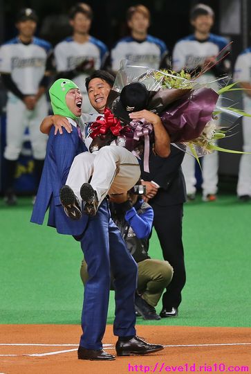 森本稀哲まりもっこりで笑いに満ちた實松一成選手引退セレモニー♪ ファイターズ 2019年09月27日 9月26日、實松一成選手の引退セレモニーと胴上げ。 超厳選した写真枚数での更新にさせて欲しいのですが、 この枚数でもどんなセレモニーになったのか きっと分かって頂けるチョイスのつもりです。 試合開始前に行なわれたセレモニー。 實松選手とは同期入団の野球解説者・森本稀哲氏が 『まりもっこり』に扮して沢山の笑いを誘い 明るい引退セレモニーとなりました♪ 試合終了後には胴上げも行なわれました。 最後にグラウンドを一周 (^-^)ノ~~ 實松選手、21年間お疲れ様でした。 ファイターズをブログランキングでも盛り上げていきたい!! 1日1回のクリックが応援の力になります。 共にファイターズを盛り上げていきましょう(^O^)/ 北海道日本ハムファイターズ ブログランキングへ エキゾチック・ショートヘア ブログランキングへ 人気記事&おすすめ広告 最近の記事 [14回]PR 1112131415161718192021