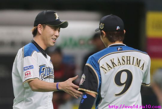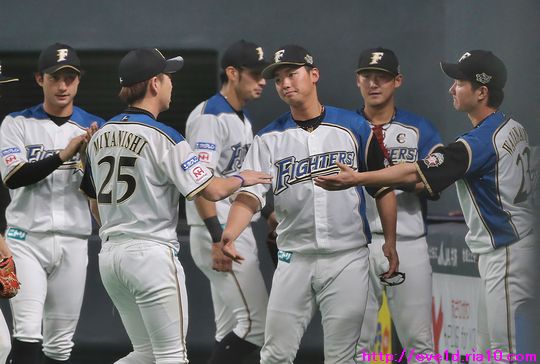 中田翔選手の指し出した手を宮西投手はギュッと握り返している所に